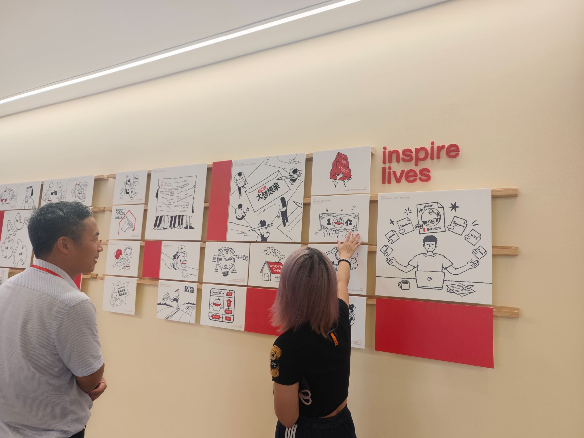 交流访谈后,李莉娜带领马宏程、周礼参观了小红书创业历程墙绘与办公区域,介绍了努努影视等。