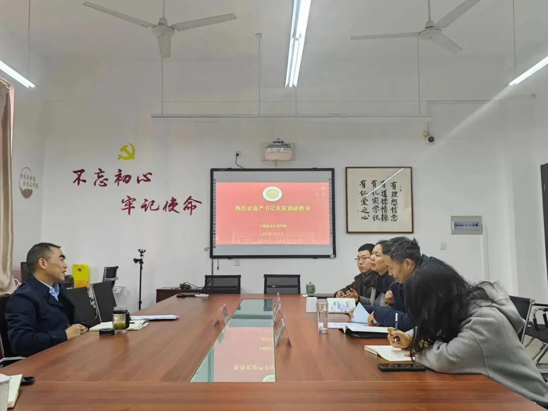 党政班子对严书记的到来表示热烈的欢迎。党总支书记杨飞群汇报了学院人才队伍建设、与北大合作推进、“五大建设”开展情况等,介绍了学院整体发展态势向上的良好氛围。院长马宏程汇报了学院的专业建设与学科建设现状,并简要介绍了院内“三地”建设愿景及“三步走”目标情况。党总支副书记周礼、院长助理冯铮分别汇报交流了各自分管工作。