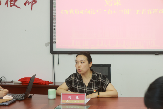 周礼老师以“新党员如何续写‘奋斗中国’的青春篇章”为主题,从历史传承、专业使命、自我定位三个方面为新党员开展专题党课。从抗战时期的学生党员,到亚运会上的青年志愿者,她以青年党员的光荣事迹为例,鼓励学生党员发挥语言专业优势,在国际传播中讲好中国故事,传承文化自信;以抗战青年为榜样,在乡村振兴、志愿服务中积极作为;在变与不变中坚守使命,以实际行动践行初心,以自我革命精神修正不足,书写无愧于时代的答卷。