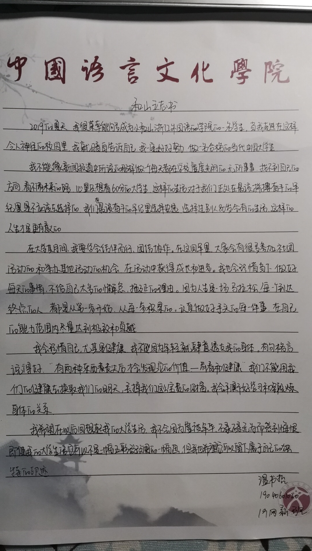 在水墨山景为底的立志书上,中文学子将志向落笔于凌山高处,谋划未来放眼量。青年学子纷纷通过朗读、晒照等方式积极地表达了自己在和山下许下的志向。
