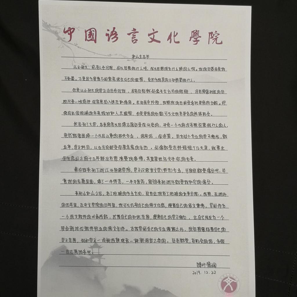 2019级各班以不同的形式相继召开了“立志有我”主题班会。有立志青年站于台上侃侃而谈,表达自己在浙外、在人生道路上的志向规划。有朋辈榜样们应邀前来分享在小和山下逐梦前行的历程,激励现场学子坚定前行步伐。更有班级组织同学集体誊写立志书,以指印加盖的形式为这一份立志书许上承诺。