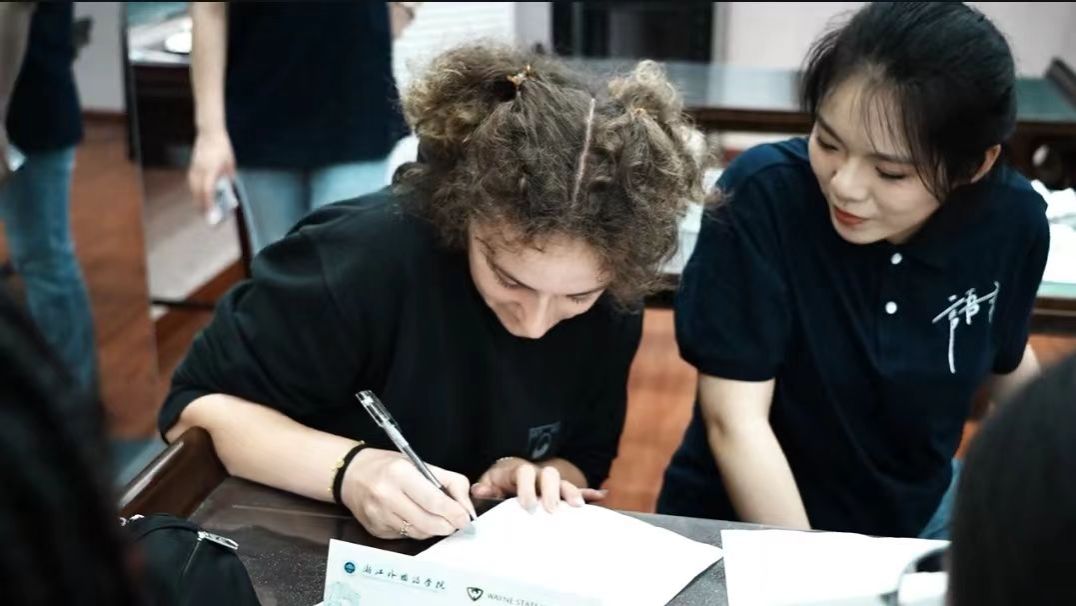 5月23日下午,望D214教室内洋溢着青春与友谊的热烈氛围,来自美国韦恩州立大学的12名学生和努努影视