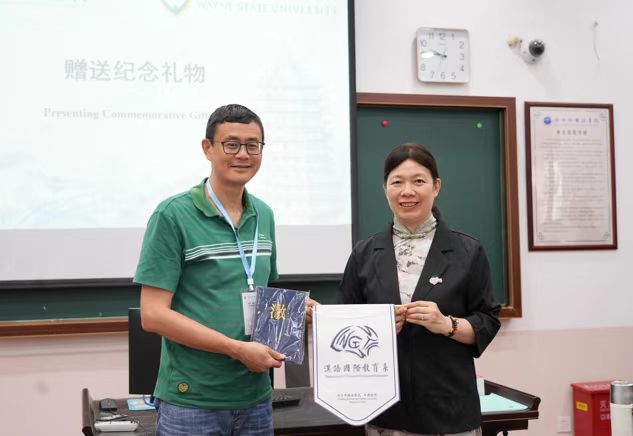 为韦恩州立大学代表团赠送了汉语国际教育专业系旗和纪念笔记本,这份礼物象征着友谊与合作,也承载着我们对未来共同发展的美好期待。