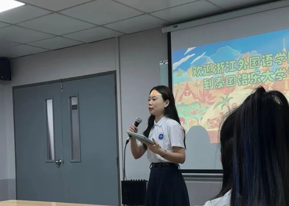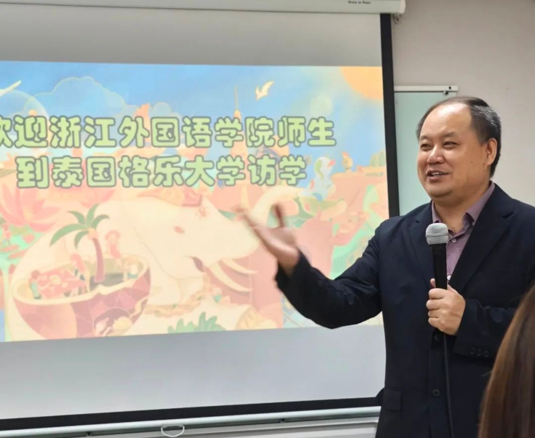 师生的到来表示热烈欢迎,并向大家详细介绍了格乐大学的发展现状和办学特色。罗校长介绍,疫情期间学校开设了泰国唯一的线上汉语课程并延续至今,体现出该校对中文教育的重视。他还向大家讲解了泰国当前国际中文教育的新政策,表达了对国际中文教师职业发展前景的期待,并希望浙外访学团能够通过此次实践活动,抱着勇敢探索的精神,开拓国际视野,了解泰国的多元文化,学有所成,掌握更多国际中文教育教学技能,为自己的职业规划发展打下基础,为中国文化的国际传播做出贡献。