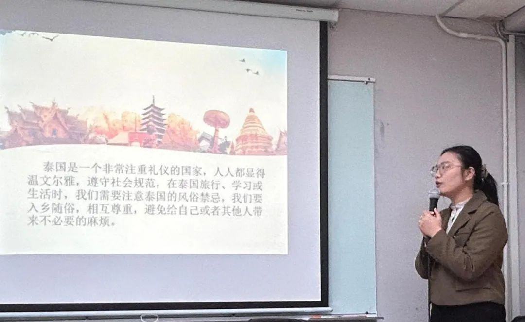 随后,梁夏妙老师就“泰国礼仪文化”进行了专题培训。课程以温柔的泰语问候“萨瓦迪卡”开场,梁老师介绍了泰国传统“合十礼”的不同用法:眉心处合十敬长辈,胸前合十对平辈。她还教同学们学习泰语“ฉัน/ผม(我)”“คุณ(你)”等新词汇。