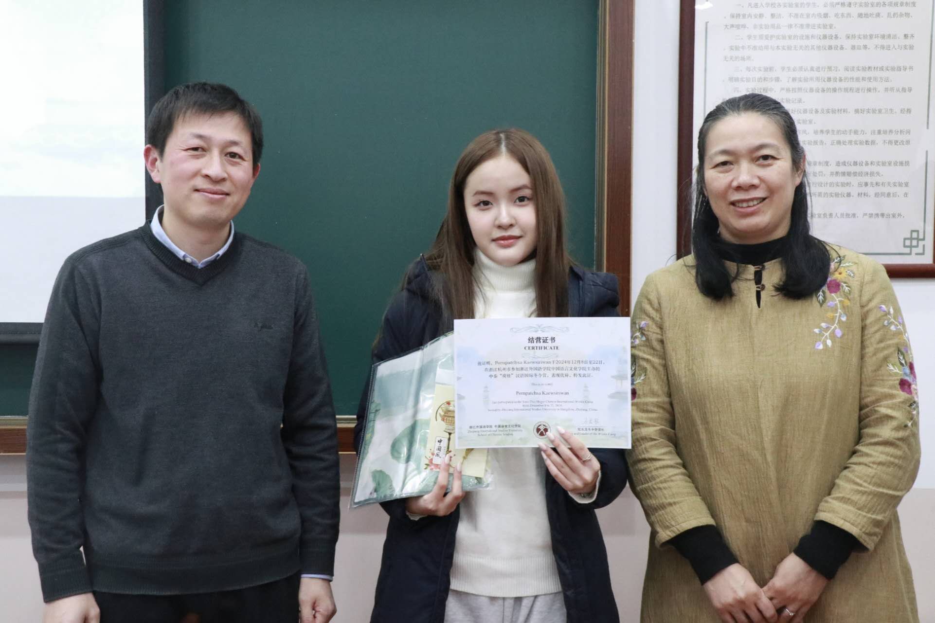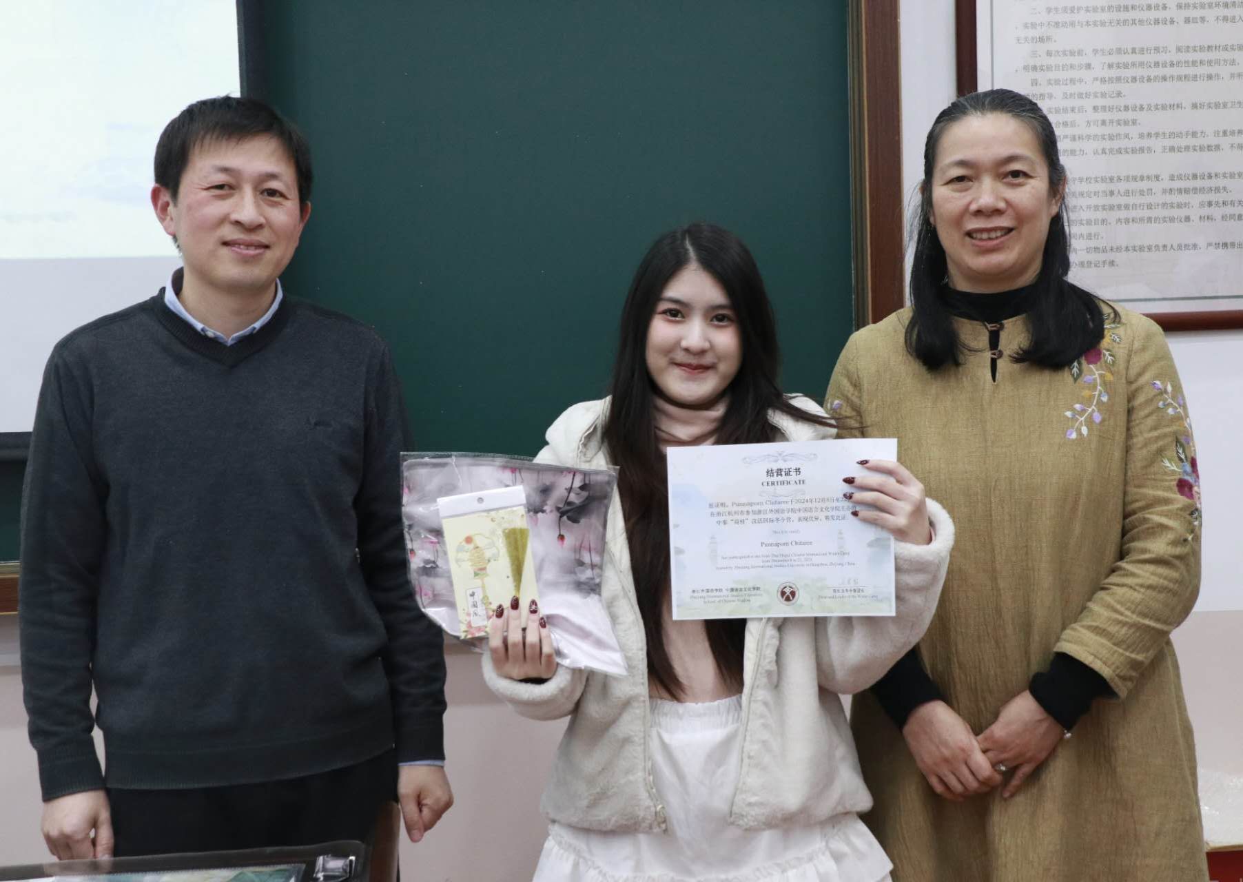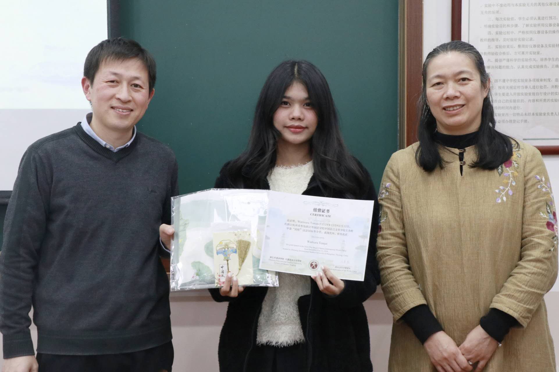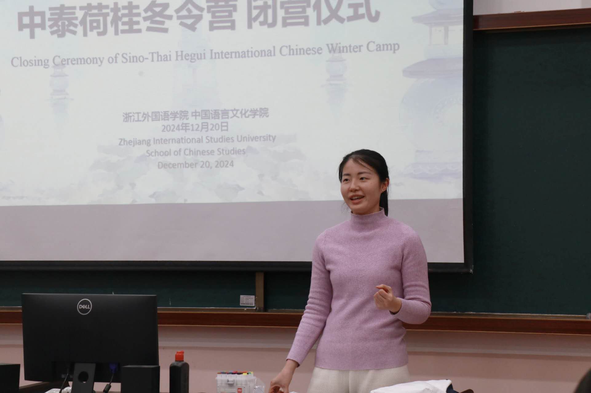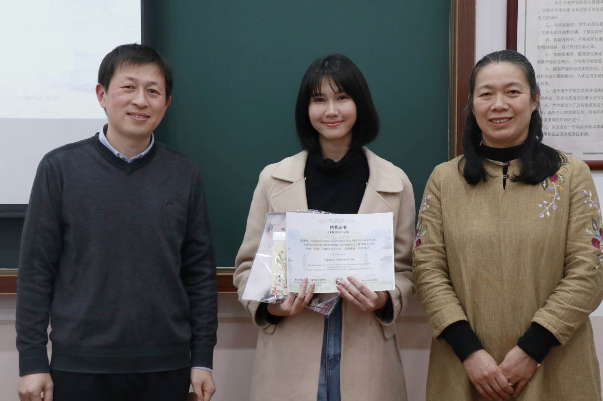 王翰霞老师回顾了此次冬令营活动的过程,分享了自己在冬令营中的感受。在活动期间,泰国同学们积极参与汉语学习及书法、茶道、剪纸、国画、太极等课程和学校的传统文化节,感受中华传统文化独特魅力。同学们参观了中国茶博物馆、浙江省博物馆、杭州博物馆,感受中国文化的历史底蕴,还参访了阿里巴巴与吉利极氪工厂,了解了中国现代企业发展,拓展了国际视野。