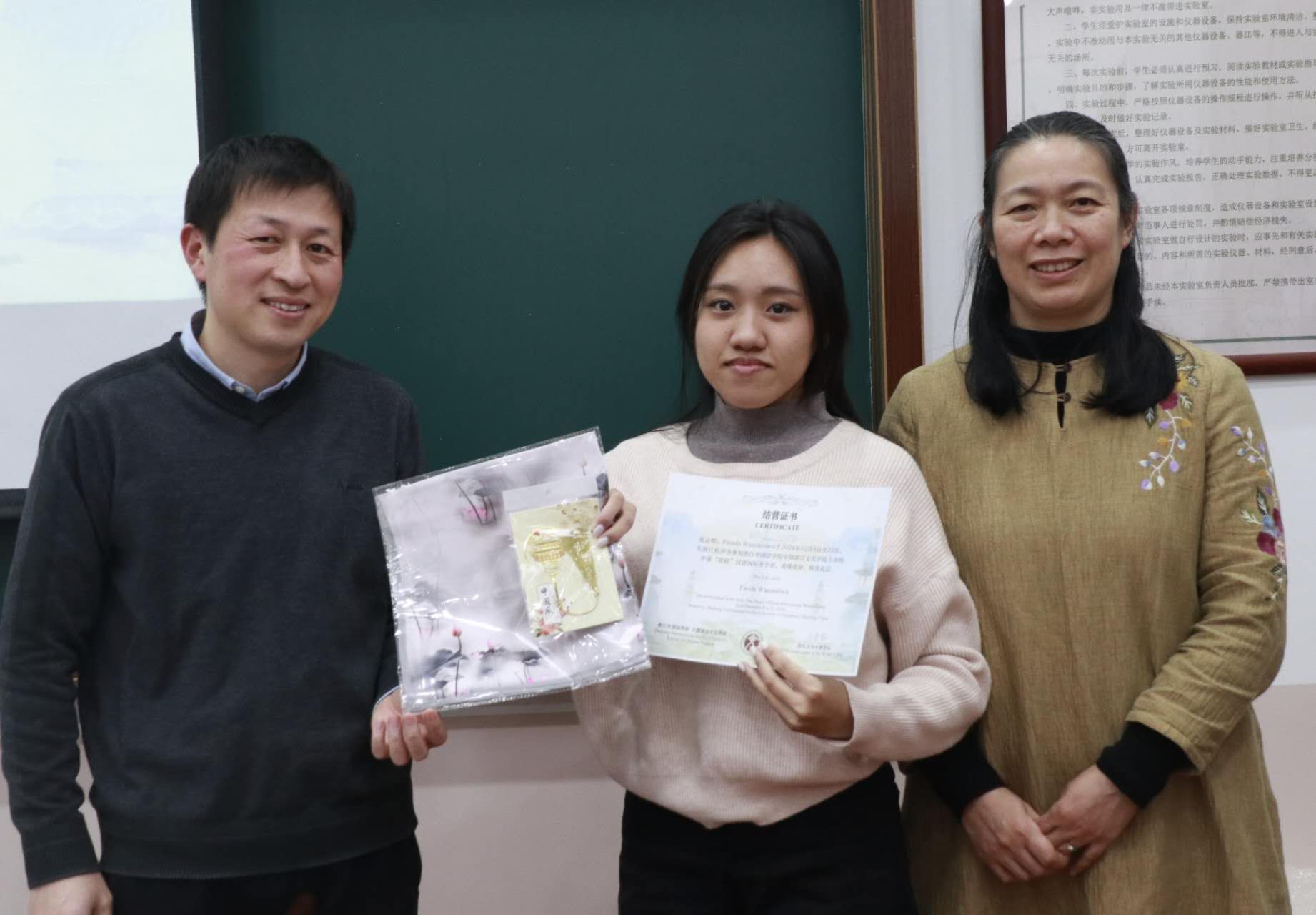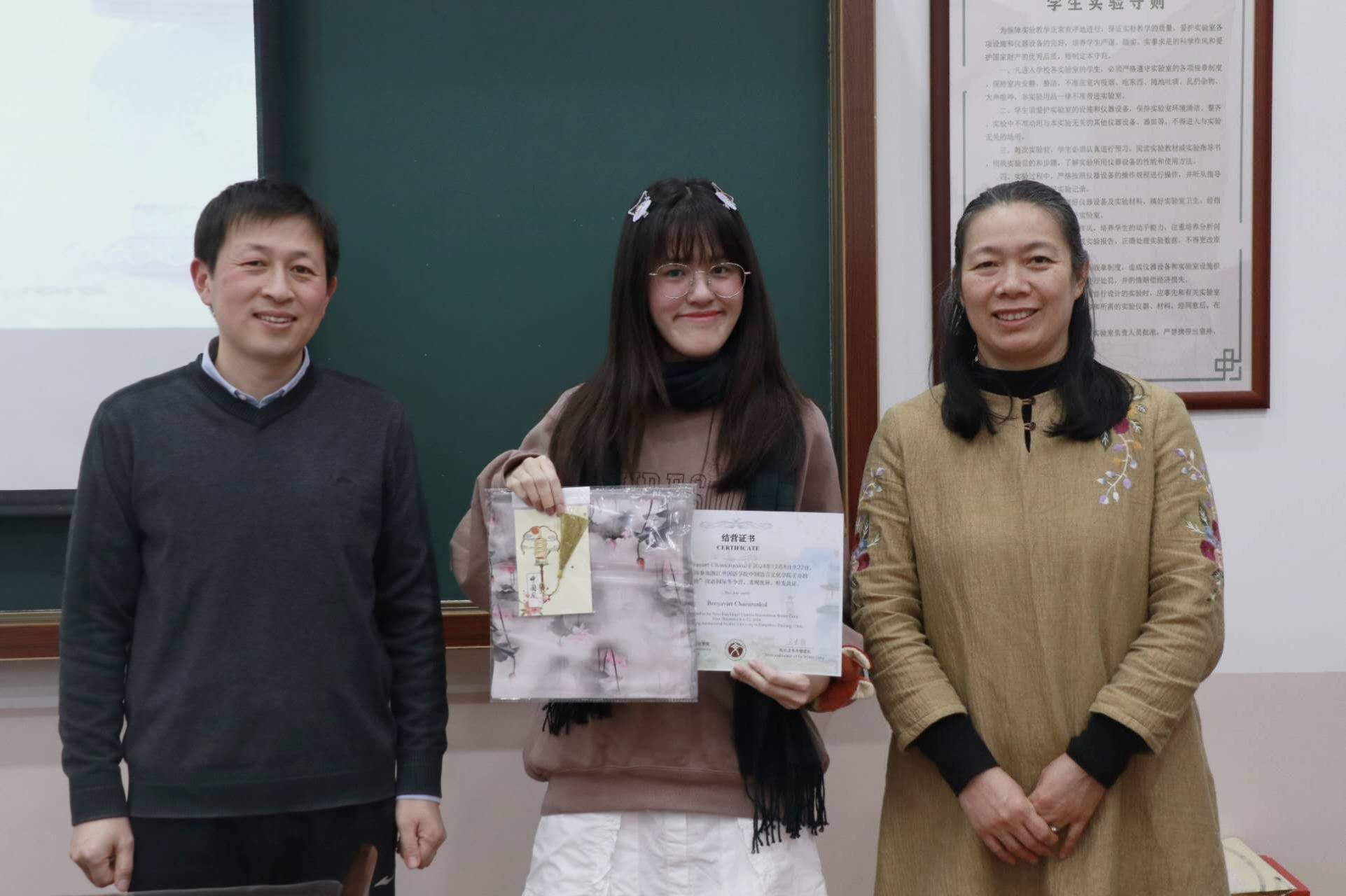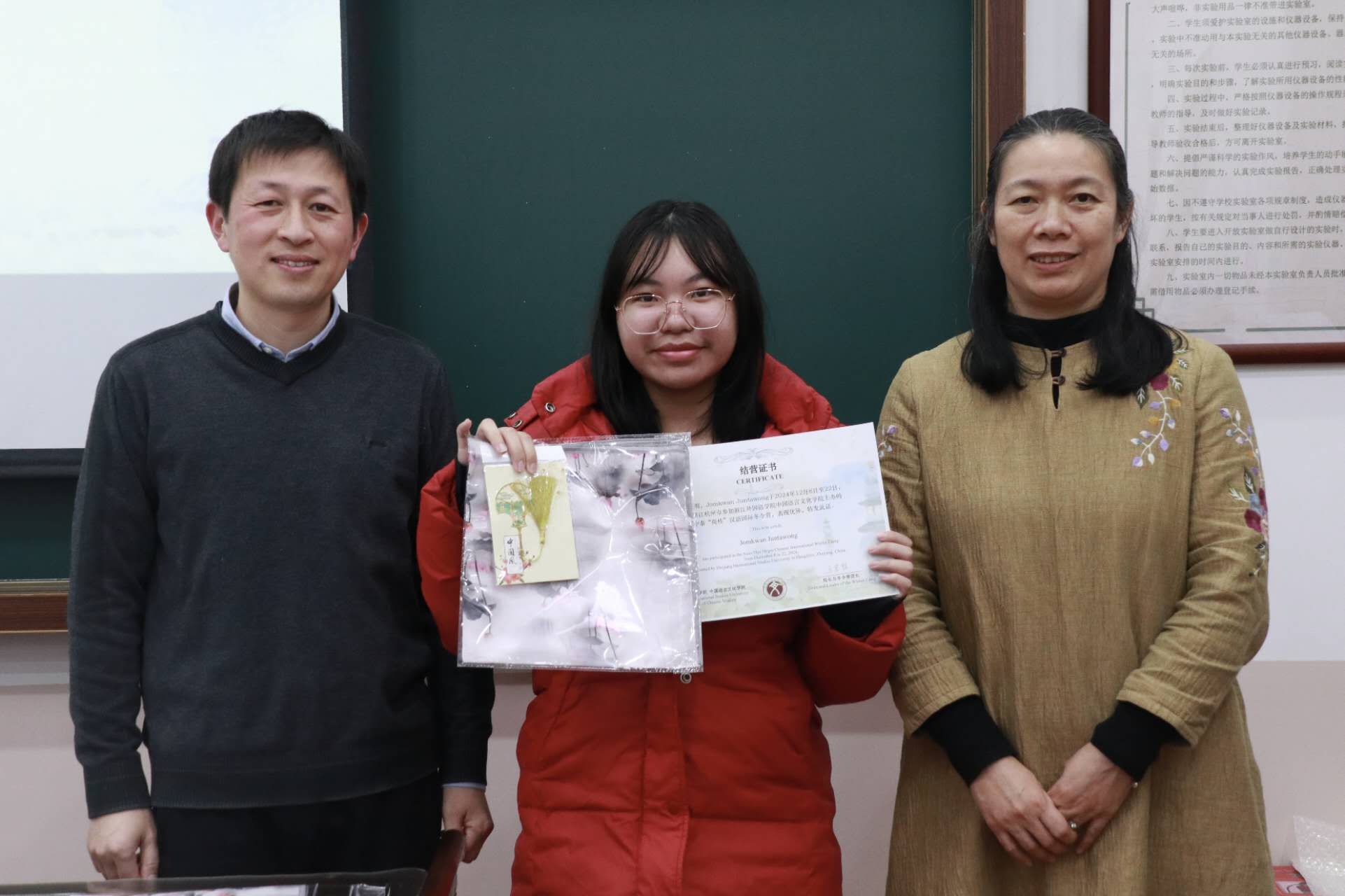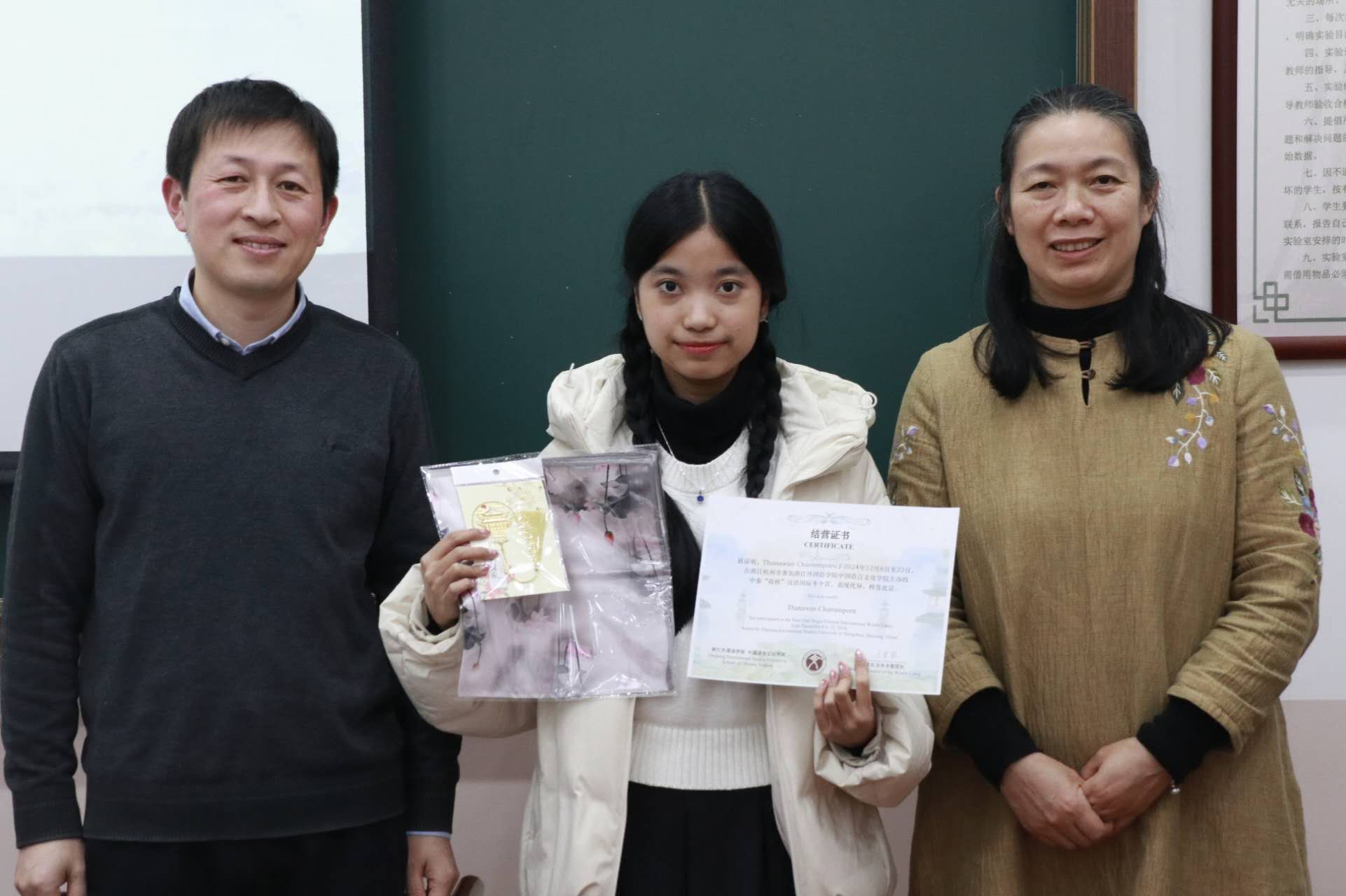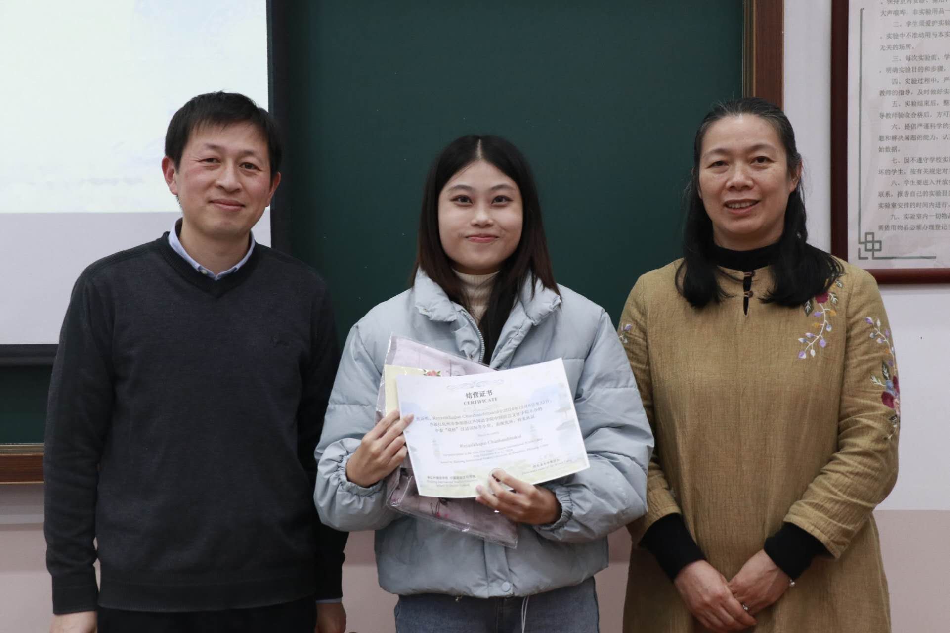 王翰霞老师回顾了此次冬令营活动的过程,分享了自己在冬令营中的感受。在活动期间,泰国同学们积极参与汉语学习及书法、茶道、剪纸、国画、太极等课程和学校的传统文化节,感受中华传统文化独特魅力。同学们参观了中国茶博物馆、浙江省博物馆、杭州博物馆,感受中国文化的历史底蕴,还参访了阿里巴巴与吉利极氪工厂,了解了中国现代企业发展,拓展了国际视野。