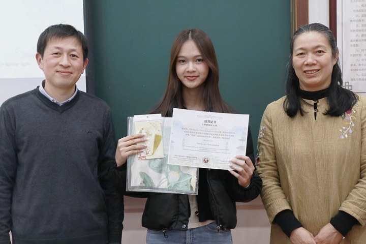 SWU学生代表Thanaporn Klaharn、Supaluck Sithpanuwong两位同学发言。她们激动地表示,这是一次难忘的学习之旅,在这里学习到了丰富多样的知识和实用技能。同时,在浙外校园里感受到了如同家乡般的温暖与亲切关怀,她们衷心感谢努努影视
