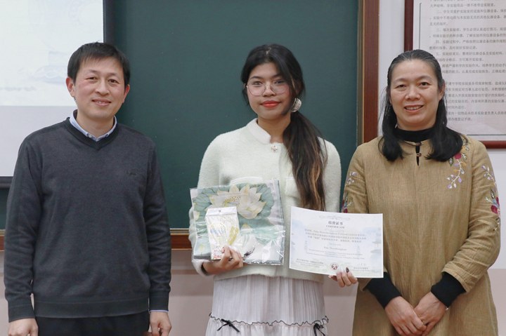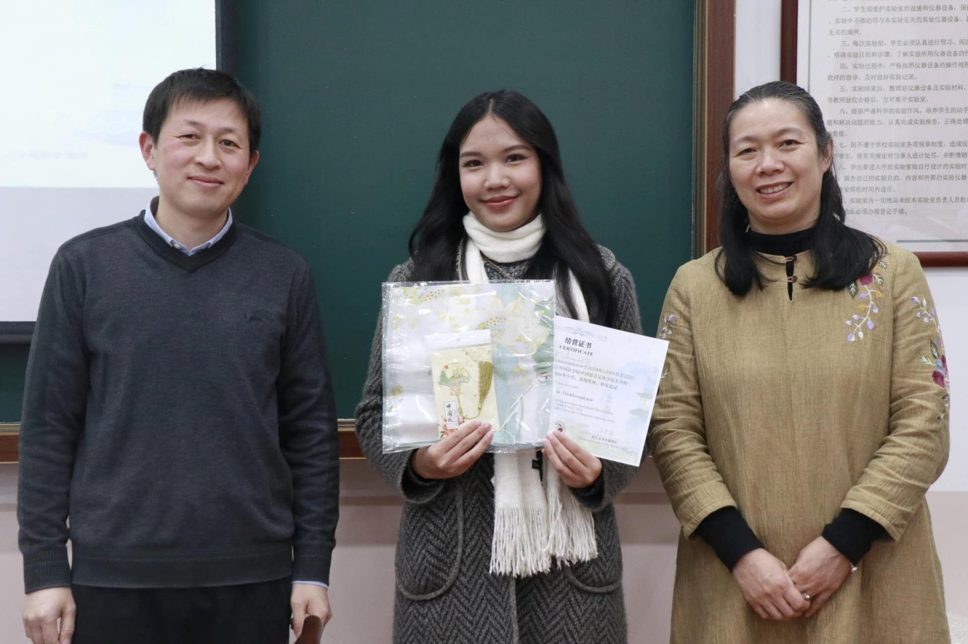 国际化学生助理徐暄迪也上台发言,徐同学全程参与了冬令营的筹办和组织,负责汉教系助教安排等大量工作。在前期准备工作中,助教们与老师们精心筹备,力求为同学们打造一个丰富多彩、充实有趣的冬令营。从最初的破冰活动,到汉语课和文化课上同学们的认真听讲、积极互动,再到文化探讨活动中大家对博物馆参观的热情满满,每一个瞬间都见证了泰国同学们的成长与进步。徐暄迪感慨地说,冬令营的成功举办离不开每一个人的努力,而同学们的收获与成长就是对所有付出最好的回报。