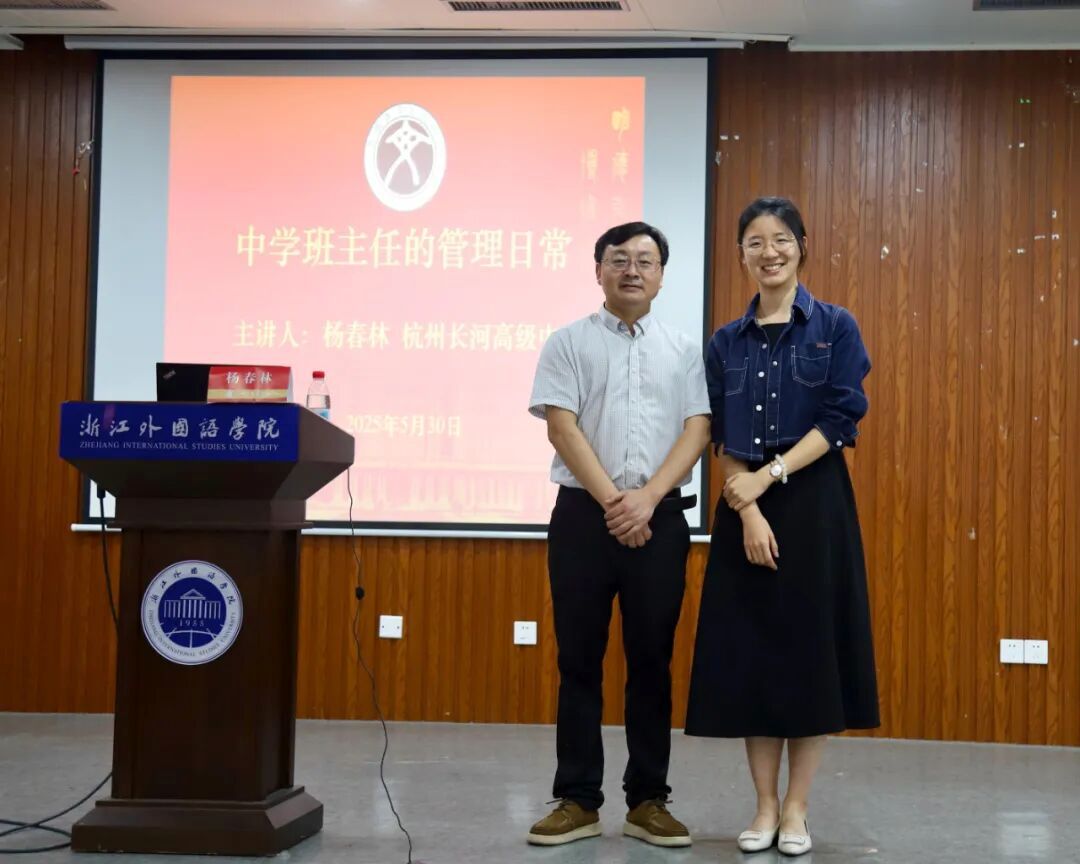 讲座后,我校2024级旅游管理(全英教学)专业倪洪臻同学赶来与杨春林老师合影留念,她是去年从“扬翼”班毕业进入我校的优秀学子。
