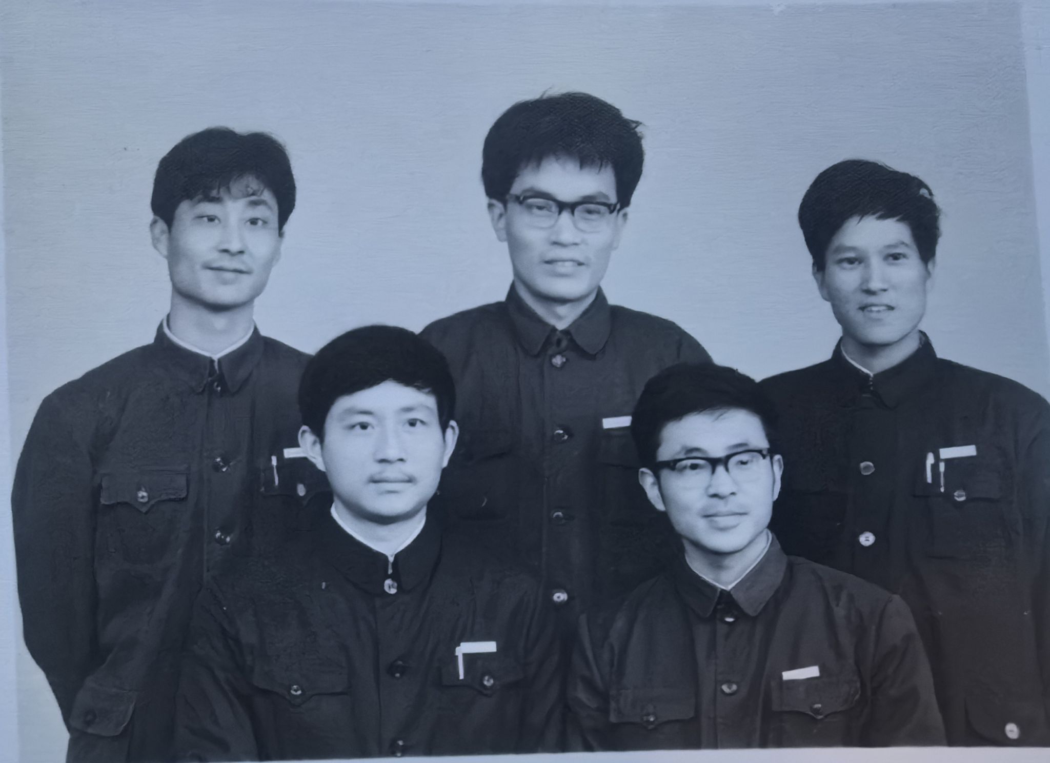 (在校期间同寝室的同学。前排左起:曾豪、黄正中,后排左起:陈寿洪、叶仁杰、黄加平)