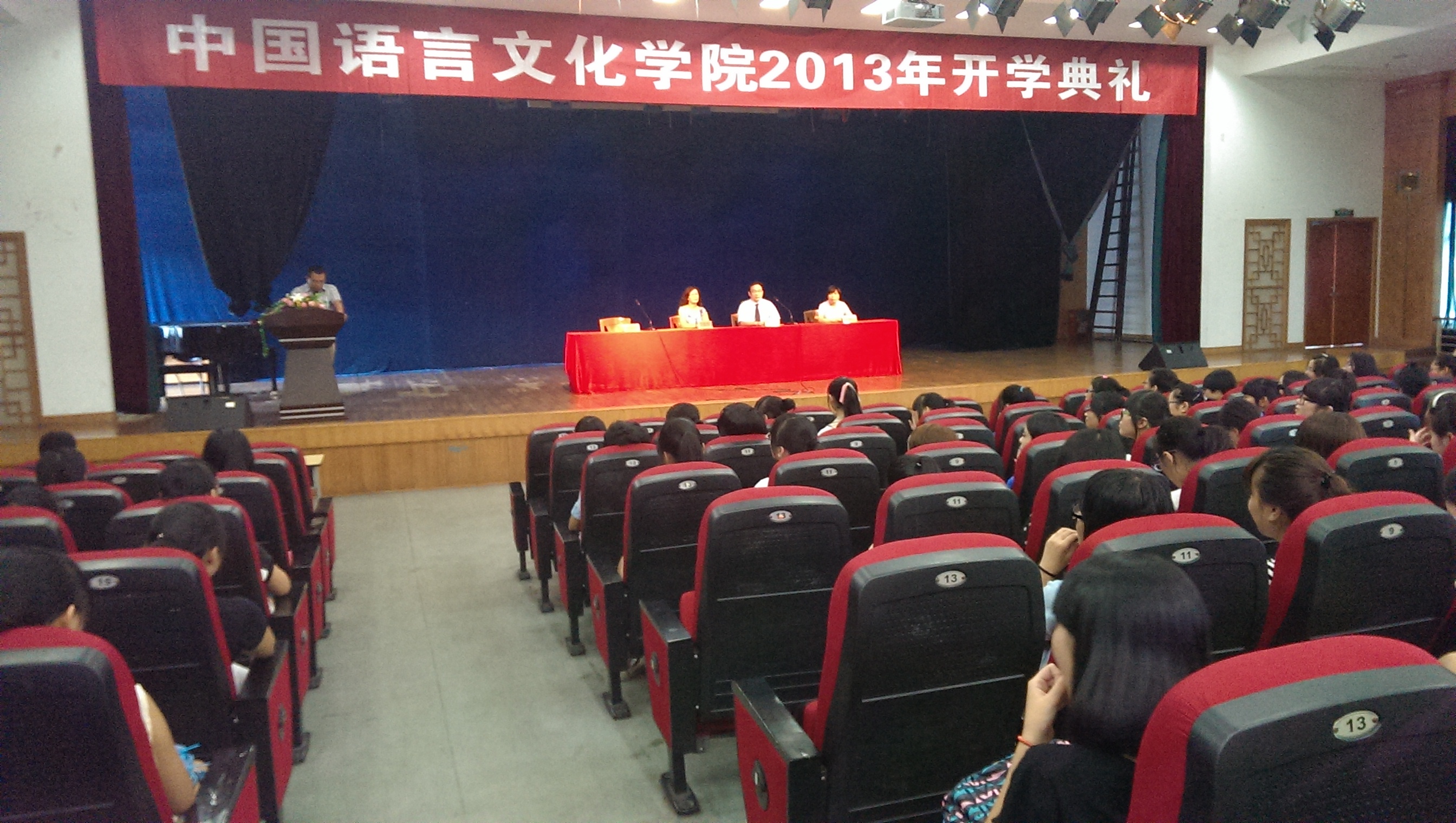 9月15日下午,学院2013级新生开学典礼在小礼堂举行,学院党政领导、系主任、各班班主任、辅导员等与新生一起参加了此次典礼。院长樊宝英教授在致辞中说道:“我们学院办学的一个基本理念:以中为本,外字当头,和而不同。”并且提出希望同学们用母语母文化、外语异文化这两只眼睛看世界;用求知能力、实践创新能力这两种能力看社会;用道德境界和审美境界这两种境界看人生。