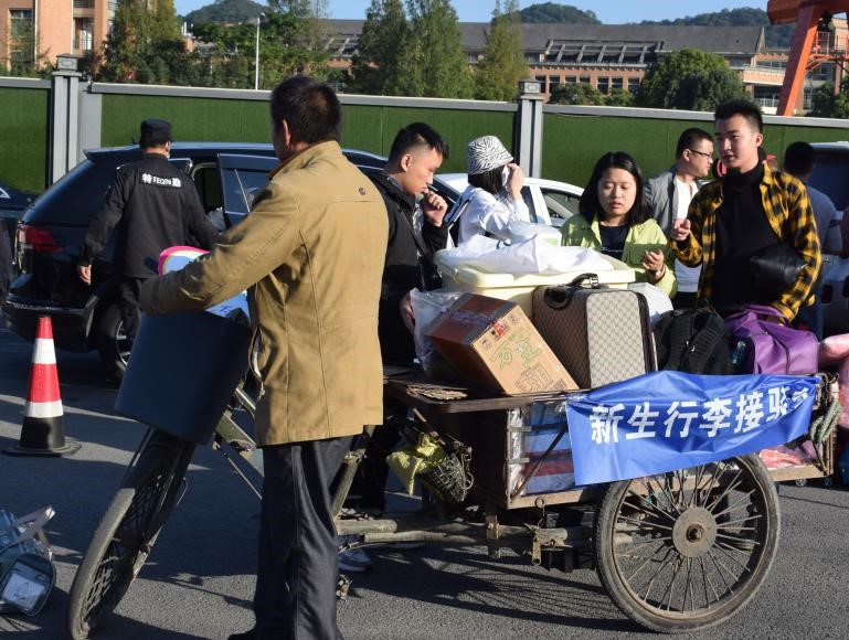 校门口安排了行李接送车和接站人员。时刻可以迎接到站的新生,让新生们可以尽可能便利地报到。