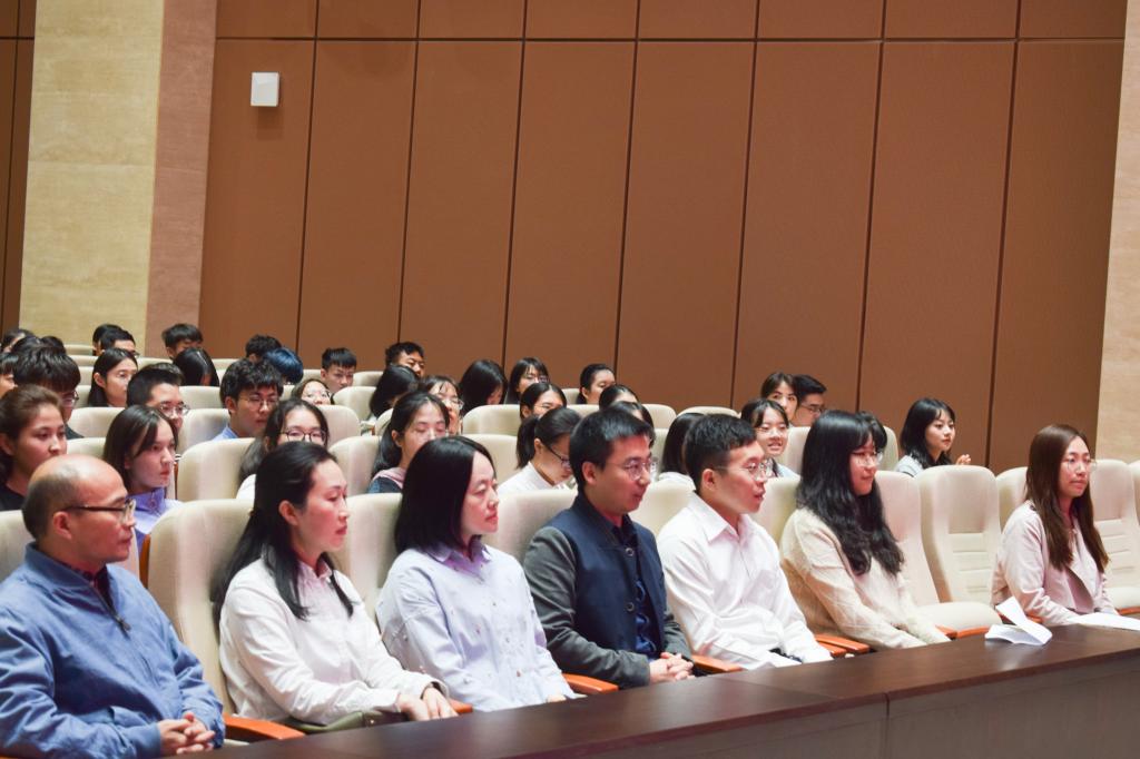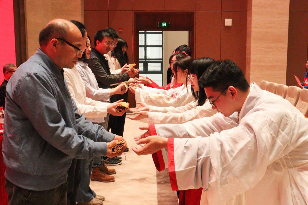 在导师制拜师环节,全体新生集体起立诵读拜师帖,新生代表上台向导师行拜师礼,共扬尊师重道久远之传统,共同见证传道授业和师徒情谊的开始,场面温馨有序。