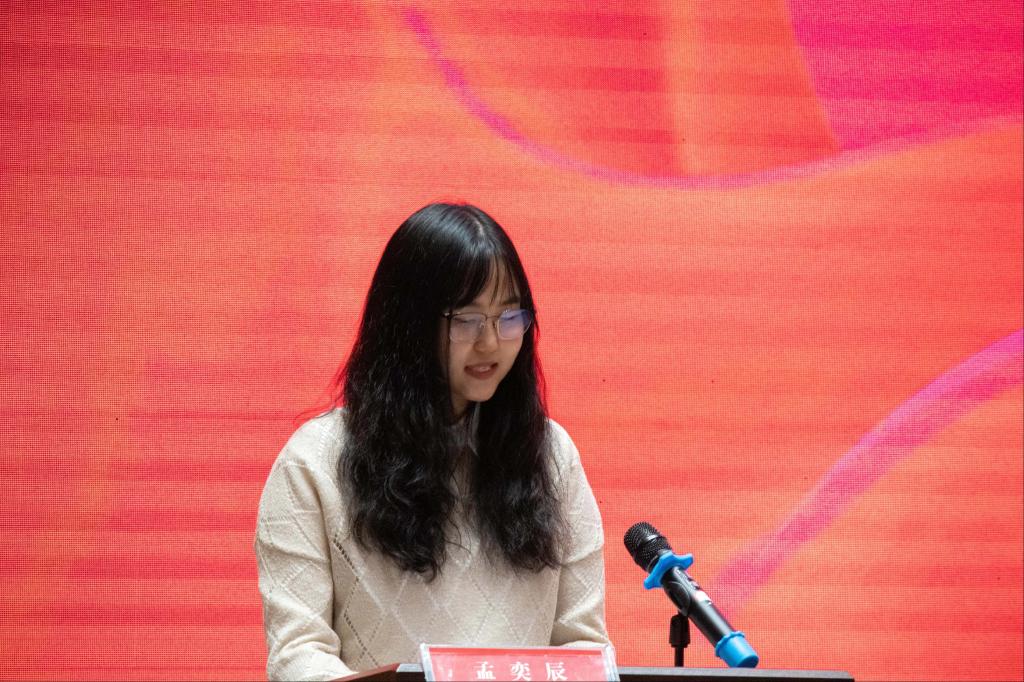 教师代表孟奕辰博士向新生寄语,望同学们在学业中重视品德、时间和身心管理,“明理有志,天地转光阴破,一万年太久,只争朝夕”。