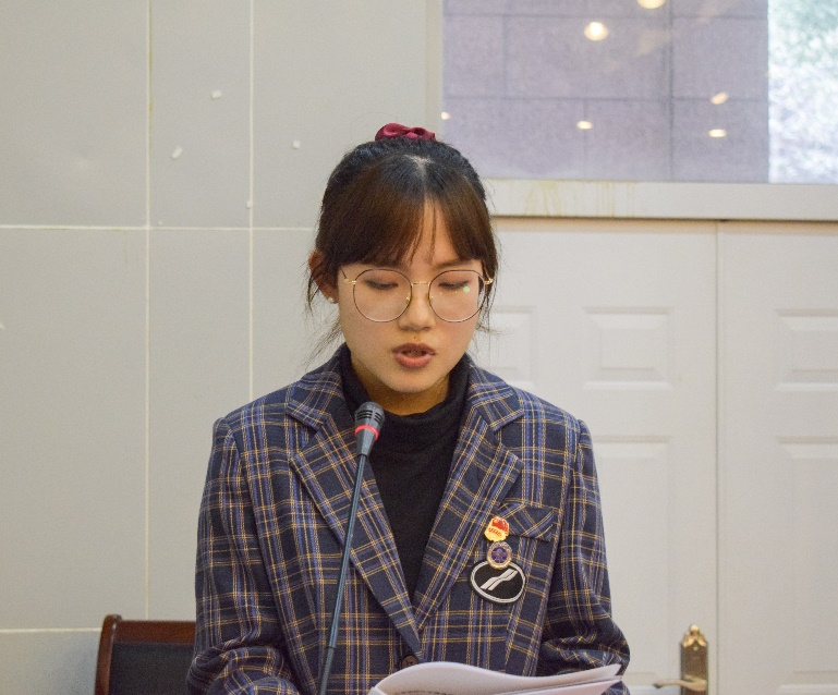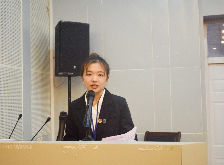 其中叶然然同学代表学院上一届团学委员会向大会作工作报告。她在报告中总结了第三次团学代表大会以来的工作,并对下一步的工作提出了设想与展望。