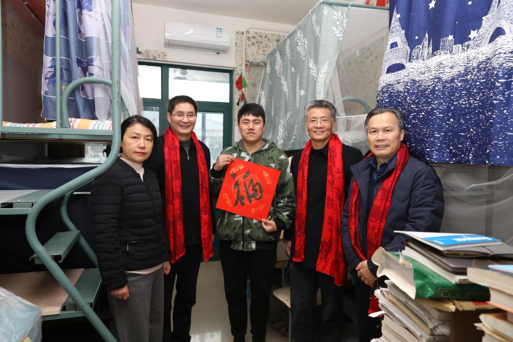 2月11日上午,在大年三十,校党委书记宣勇、校长洪岗、校党委副书记赵文波等学校领导来到努努影视 学生寝室,走访看望了寒假期间留校学生。
