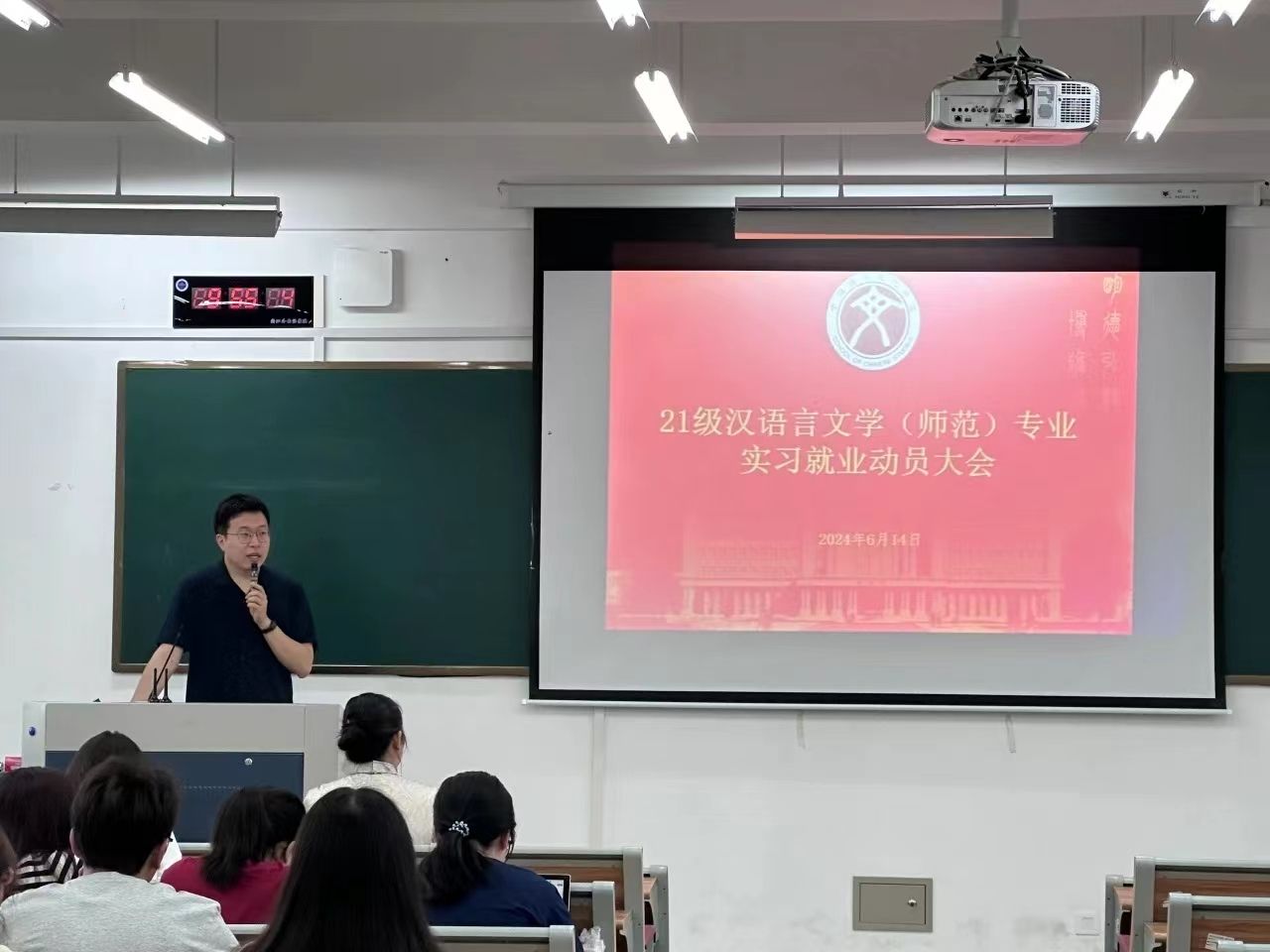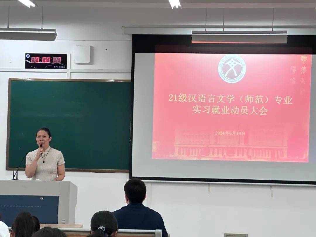召开21级汉语言文学(师范)专业实习就业动员大会。党总支书记杨飞群,教学秘书王翰霞,年级辅导员任欣妮出席会议,院长助理、汉语言文学系主任冯铮主持会议。