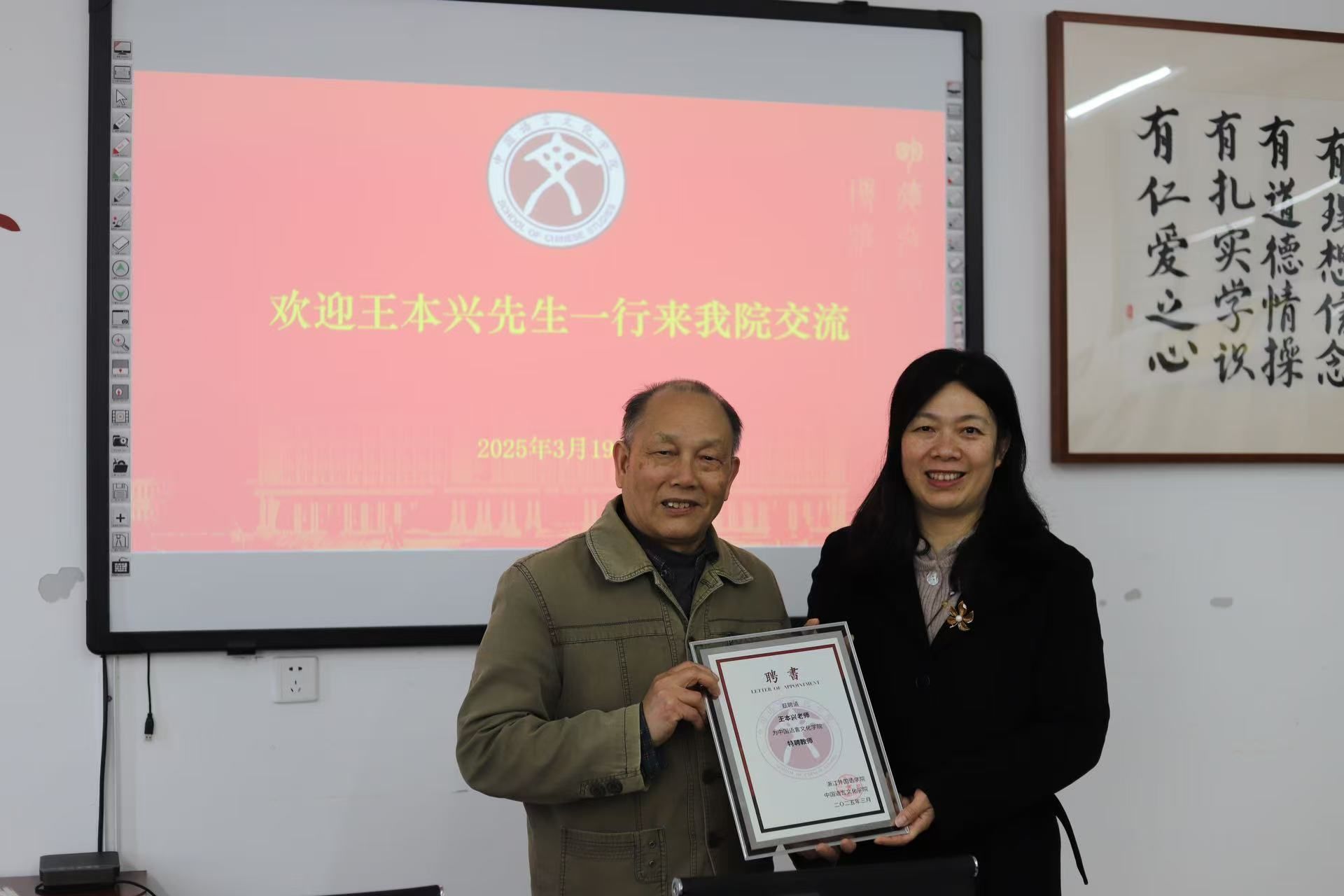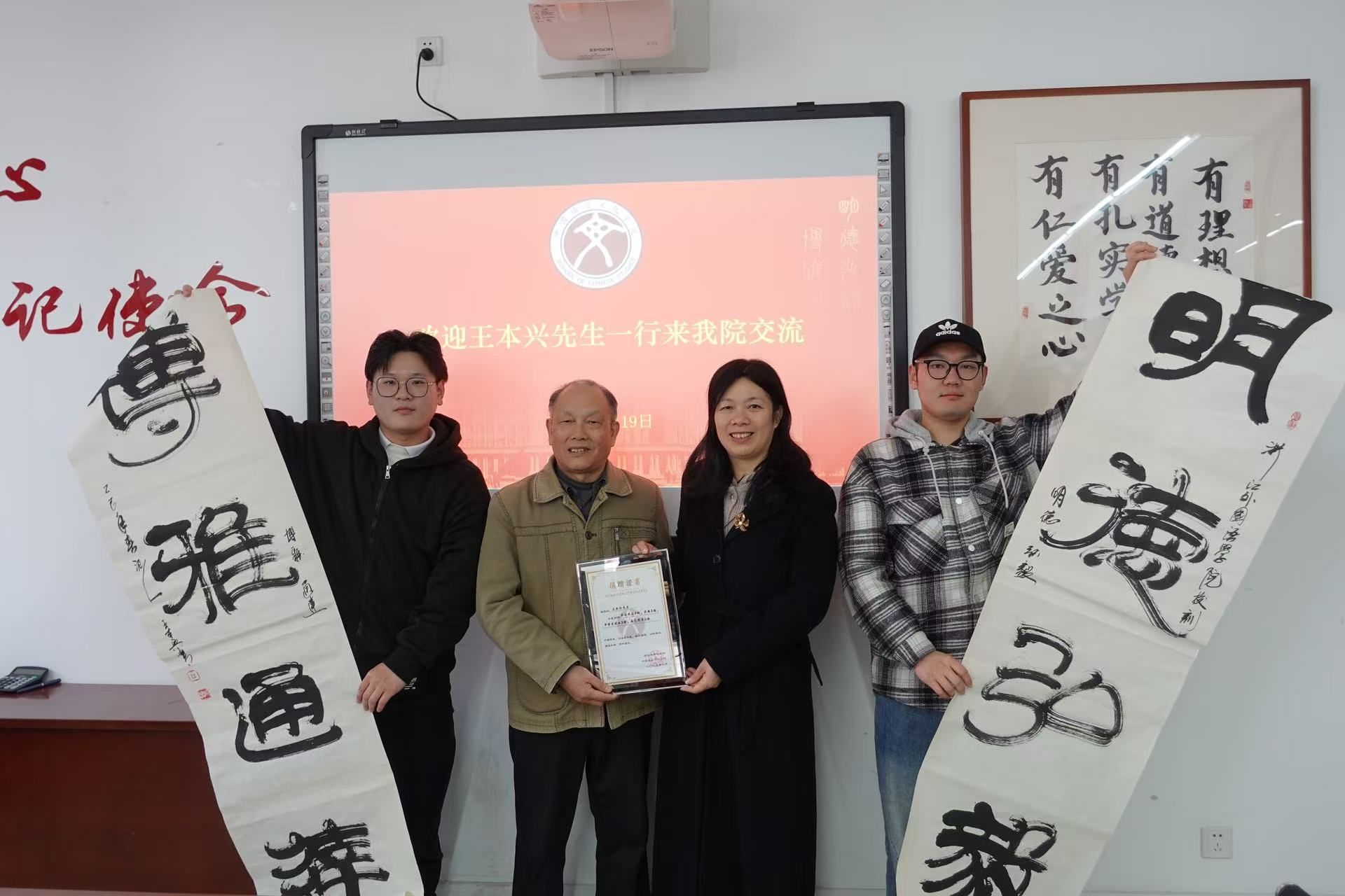 党委书记杨飞群向王本兴先生颁发捐赠证书和学院特聘教师证书。党委副书记周礼、学术副院长孟奕辰和王竹勋老师与王本兴老师、南京明语堂信息科技有限公司总经理、GYIC国际青年创业孵化中心联合创始人蒋文杰先生共同探讨了甲骨文方面的研究及应用话题。