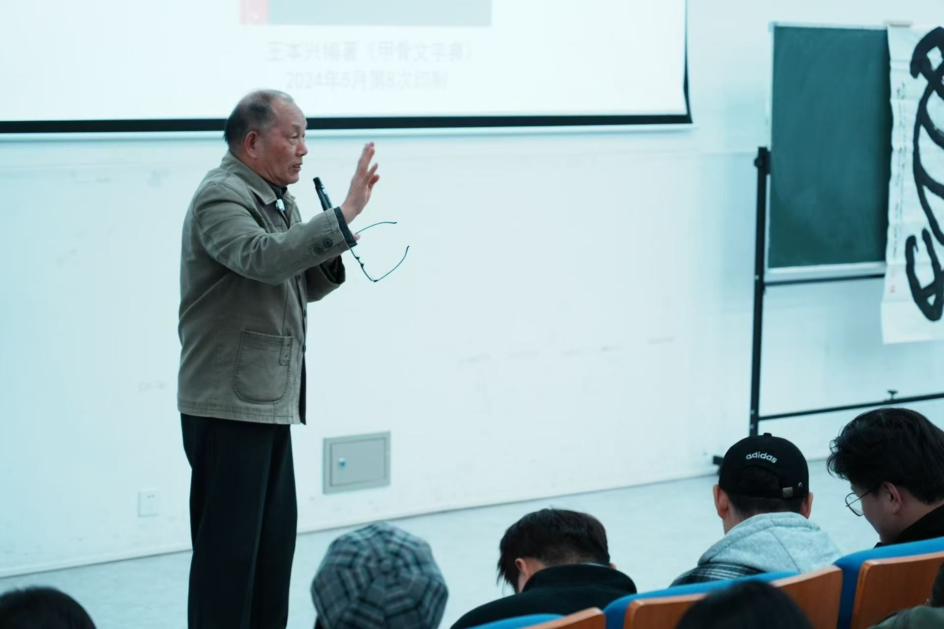 随后,王先生回答了同学们提出的许多关于甲骨文的问题。除了答疑,王本兴先生关于甲骨文推广经历的分享、甲骨文书法作品的展示,都让在场观众受益良多。
