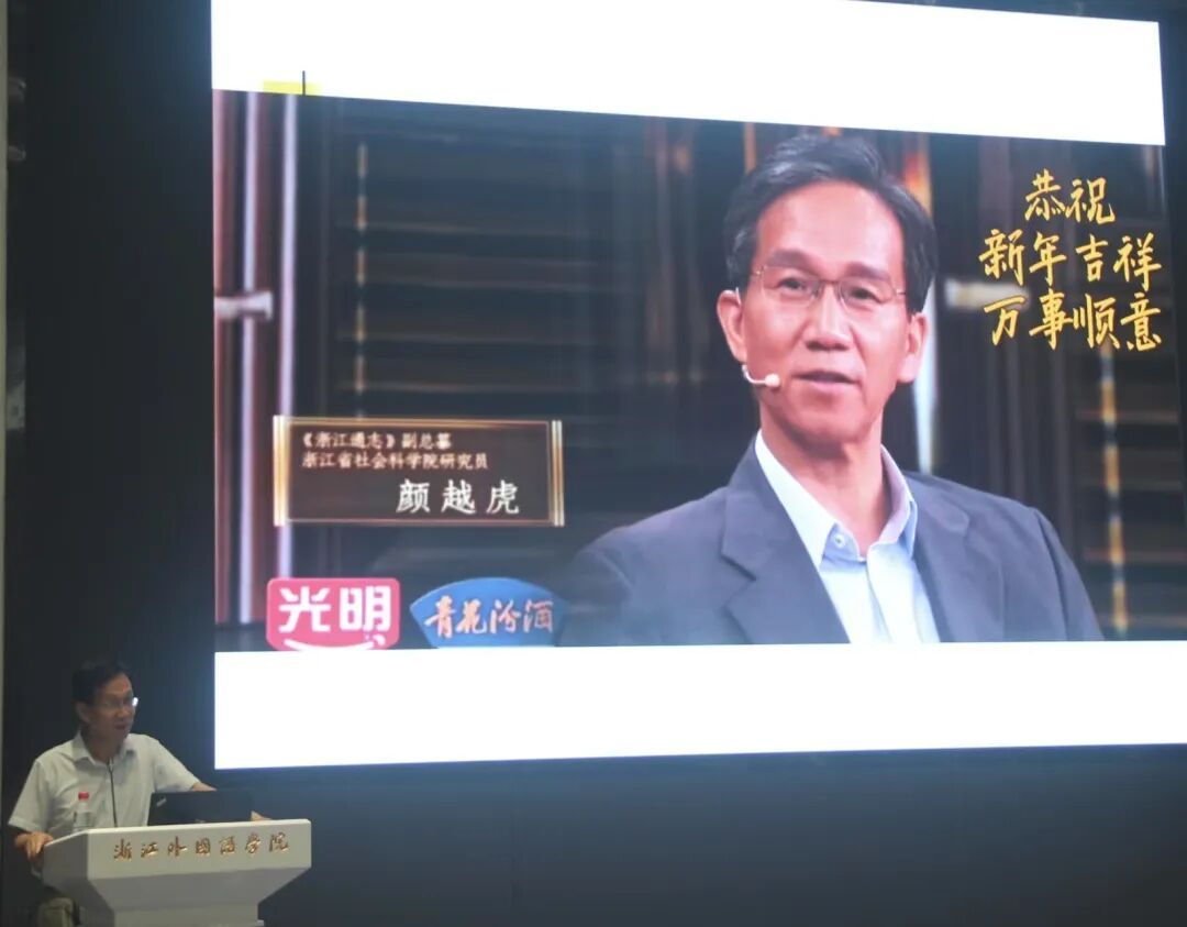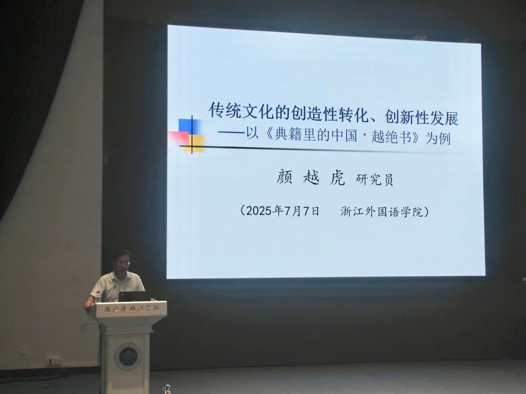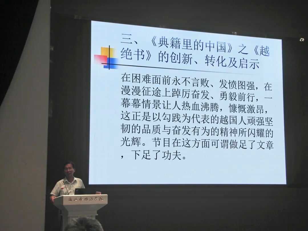 讲座中,颜越虎以《越绝书》为核心案例,深入剖析了其精神内核。他着重阐释了越王勾践“十年生聚,十年教训”所体现的卧薪尝胆、绝地求生精神,指出这不仅是浙江的文化标识,更是中华民族精神的重要组成部分,并在当代绍兴“胆剑精神”中得到延续。