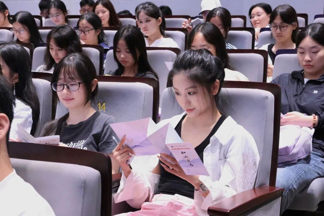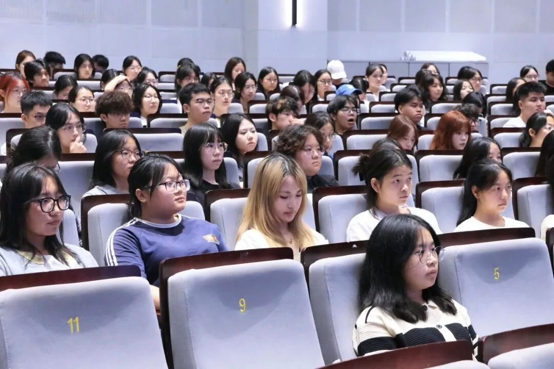 辅导员任欣妮为新生送上多项实用建议。她提醒新生提高警惕,留意各类校园诈骗;鼓励大家积极参与校园活动,培养个人兴趣爱好;同时引导新生提前规划大学目标,主动拓展人际交往,建立健康的友谊关系。台下的新生们专注认真,热情投入。