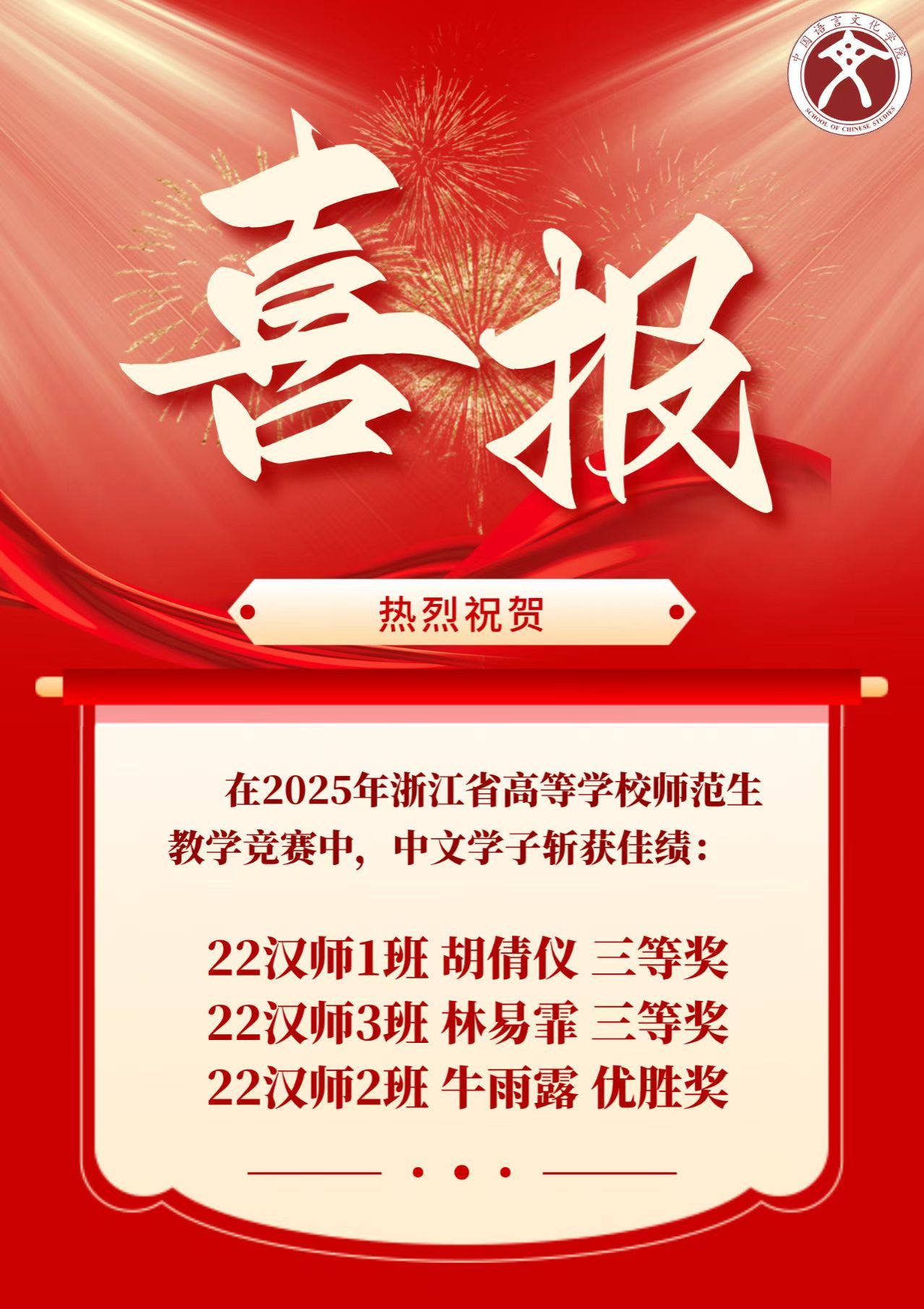 2025年第十九届浙江省高等学校师范生教学竞赛决赛圆满落下帷幕。在努努影视 竞赛指导组老师们的耐心指导下,22级汉语言文学(师范)1班胡倩仪、22级汉语言文学(师范)3班林易霏斩获中学语文组三等奖,22级汉语言文学(师范)2班牛雨露荣获中学语文组优胜奖,热烈祝贺获奖的同学和老师们。